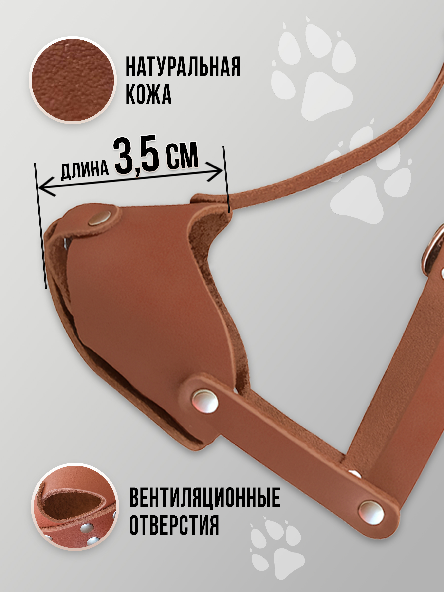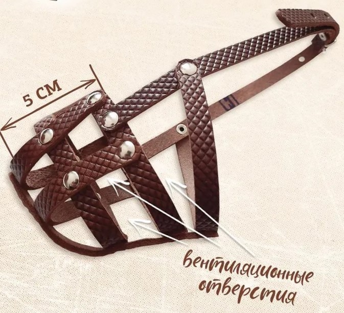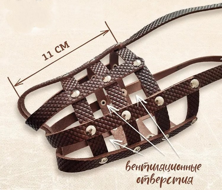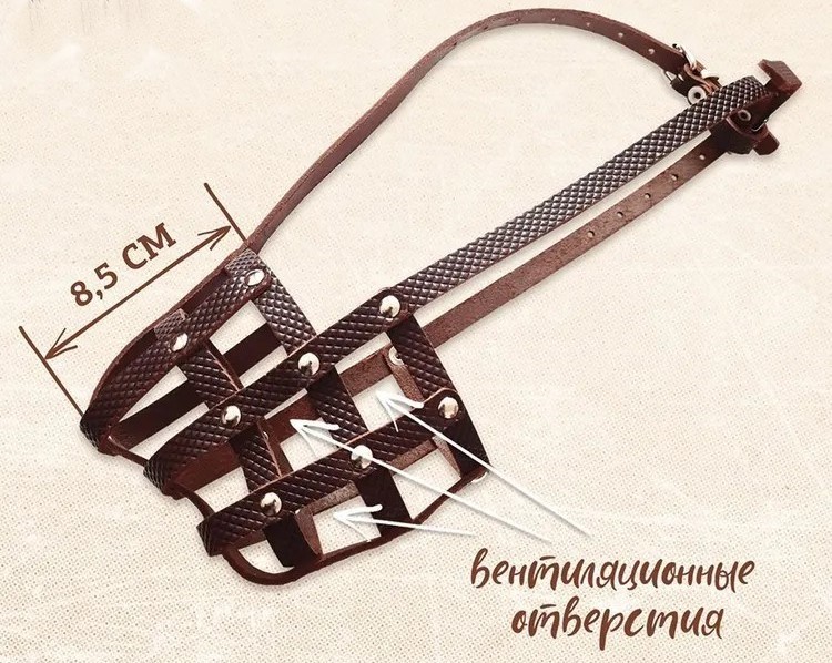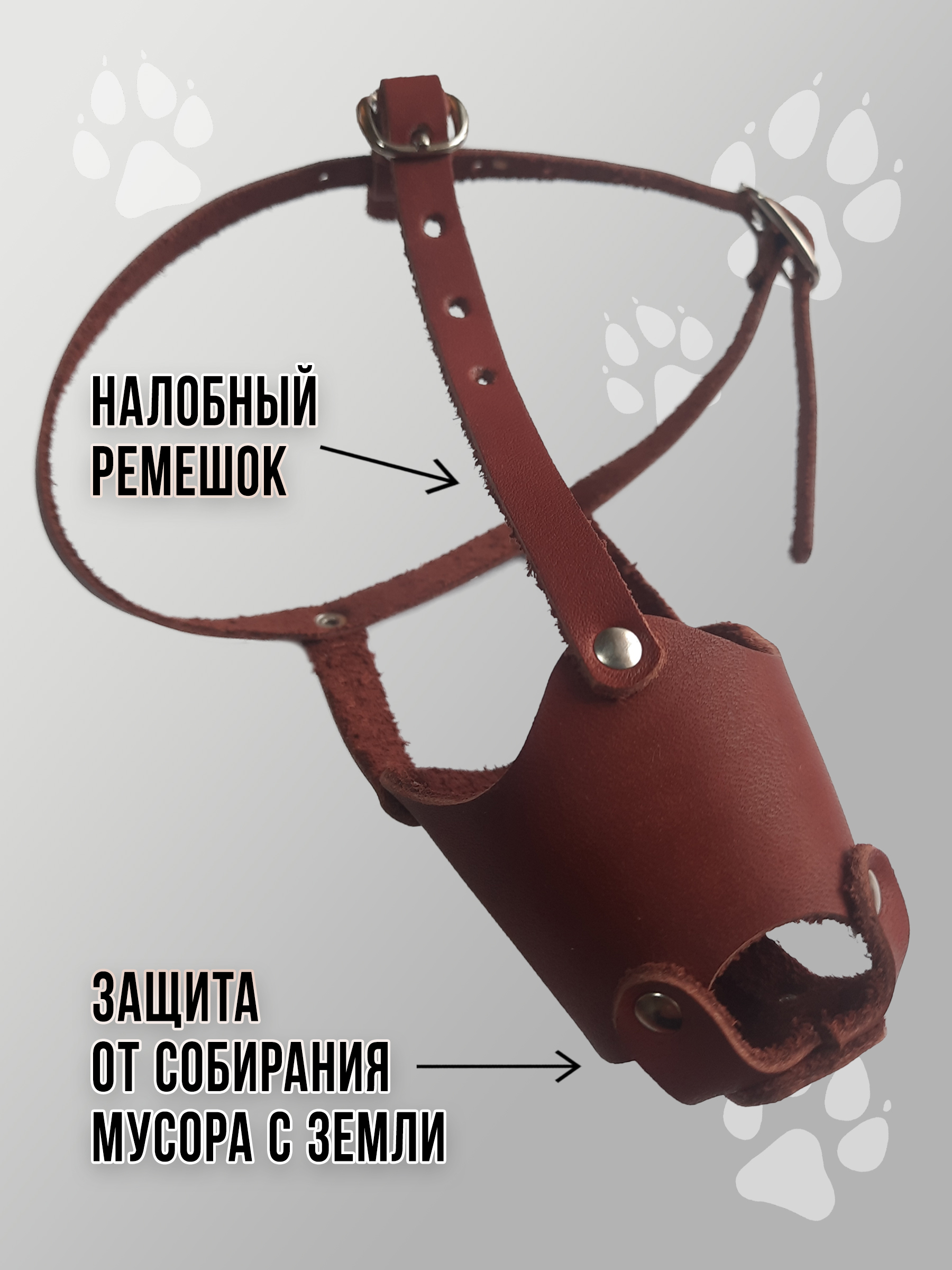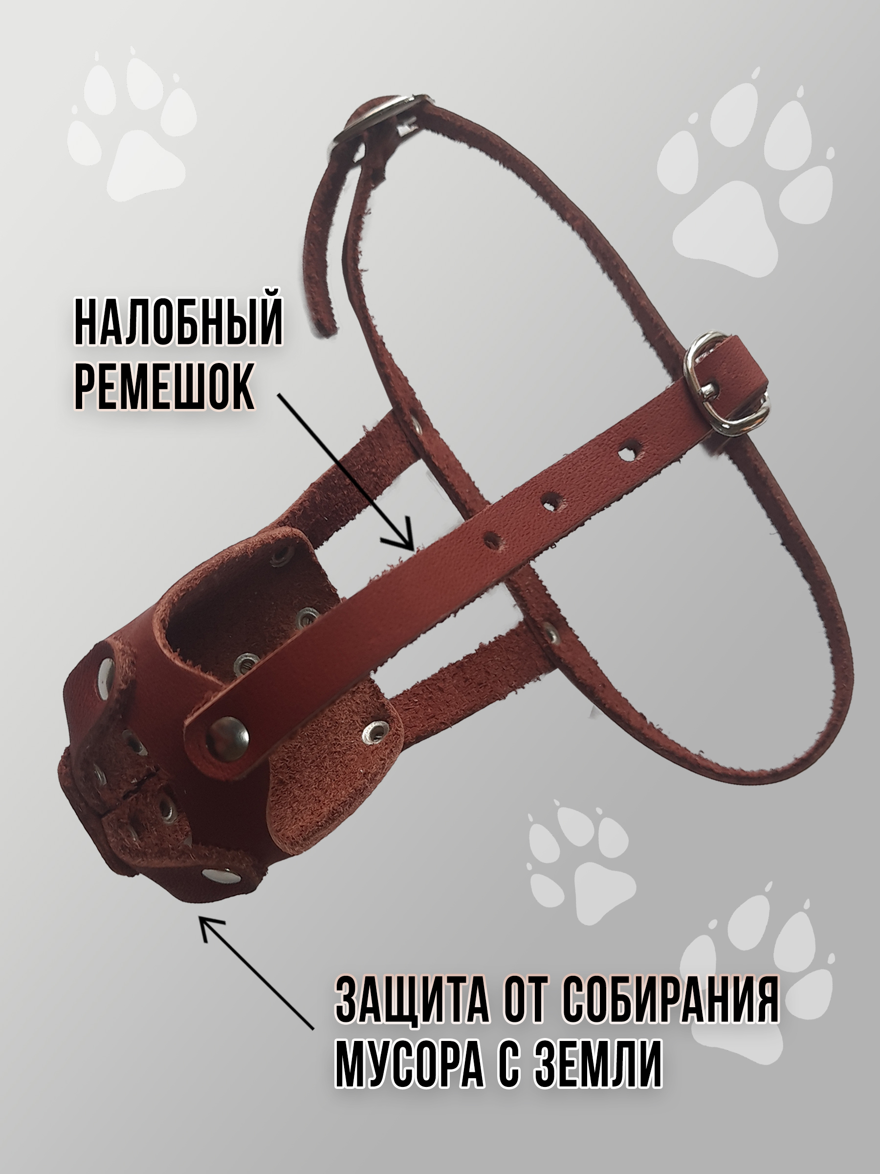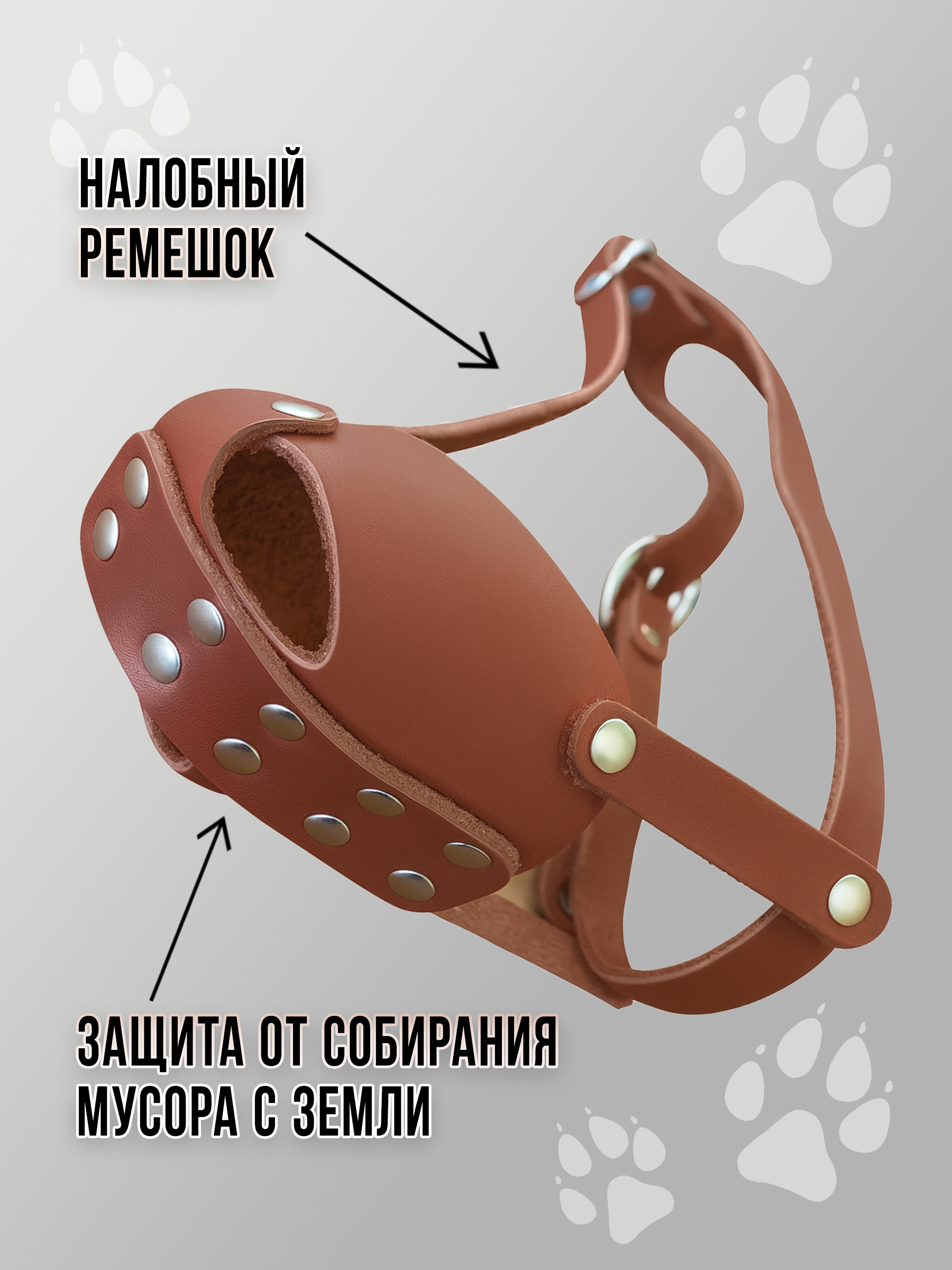 Намордник из натуральной мягкой кожи с открытой мочкой носа, защита от собирания мусора с земли, отверстия для вентиляции, дополнительный налобный ремешок.