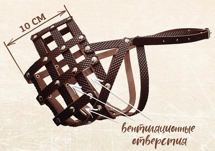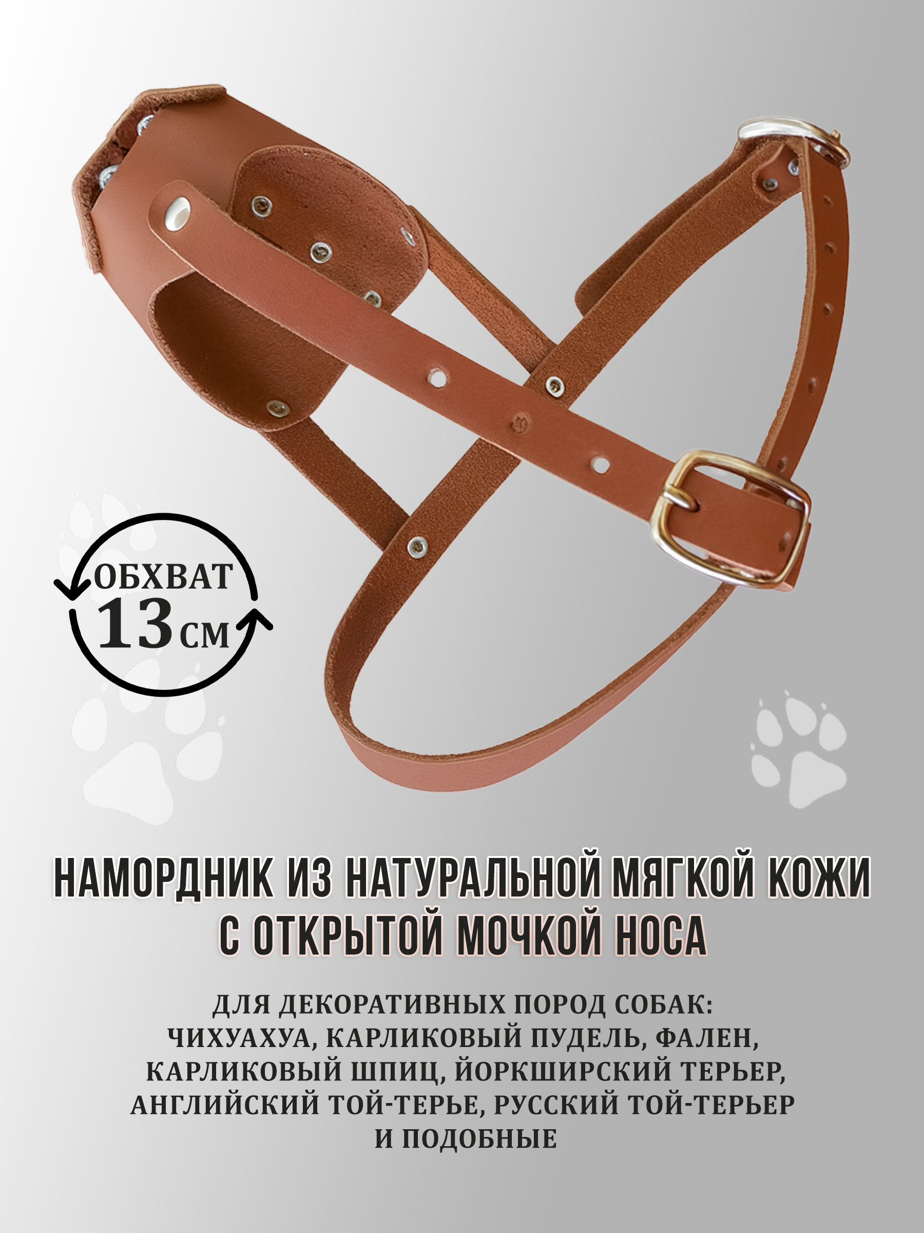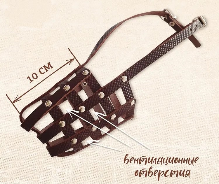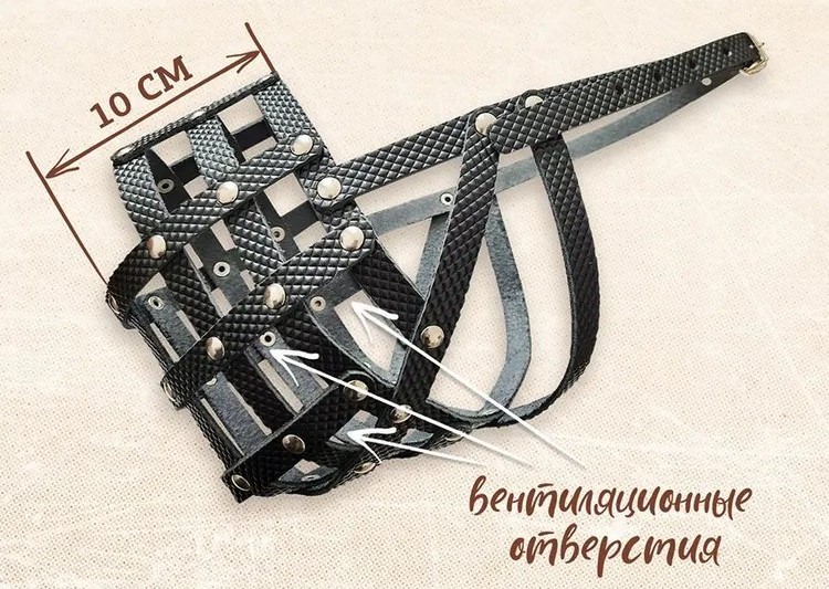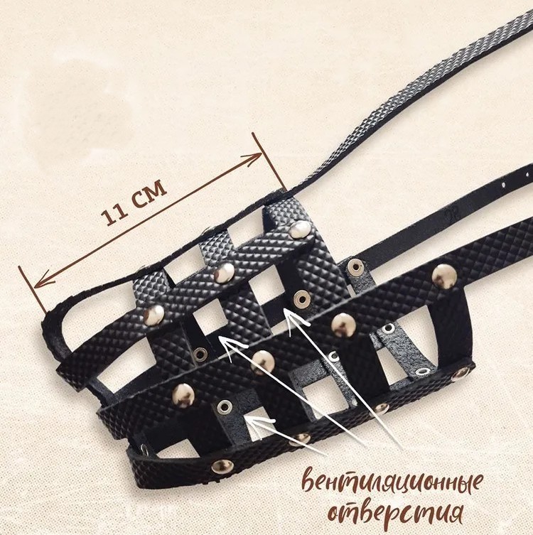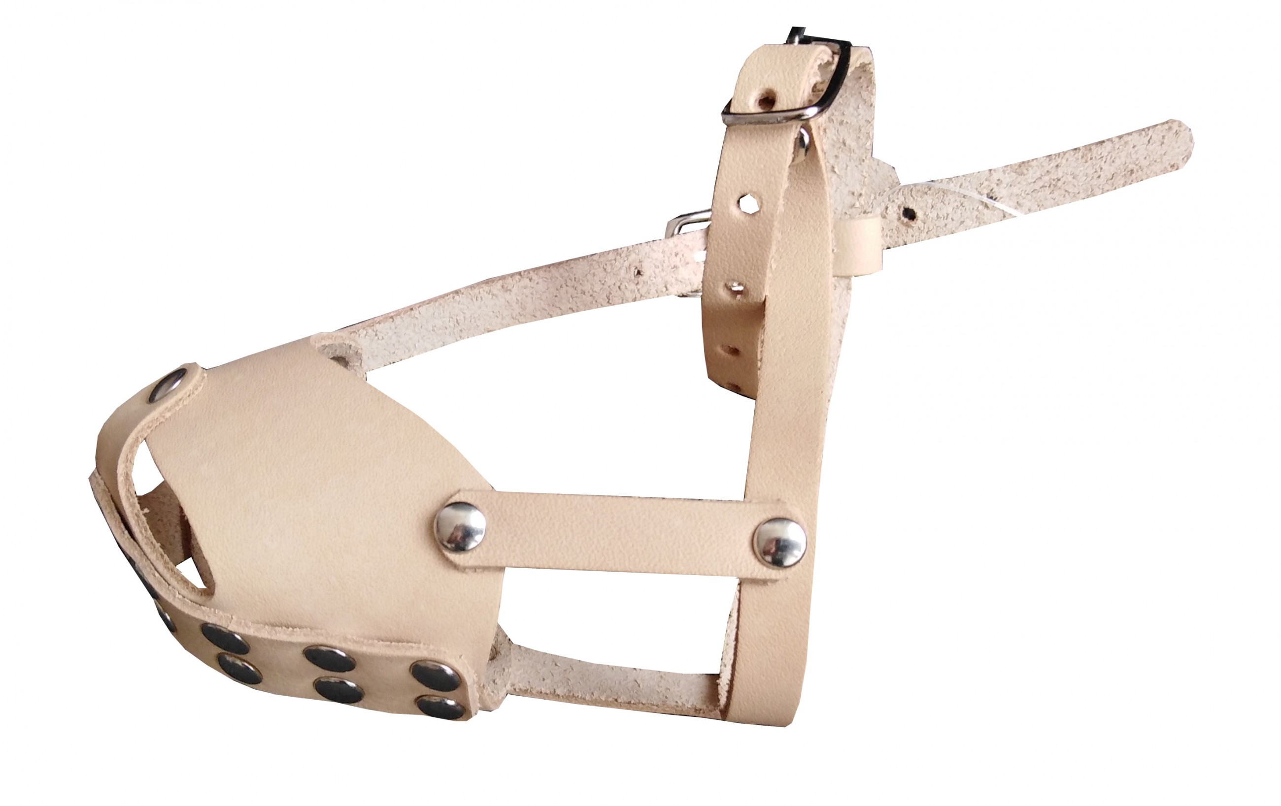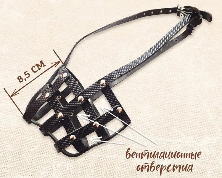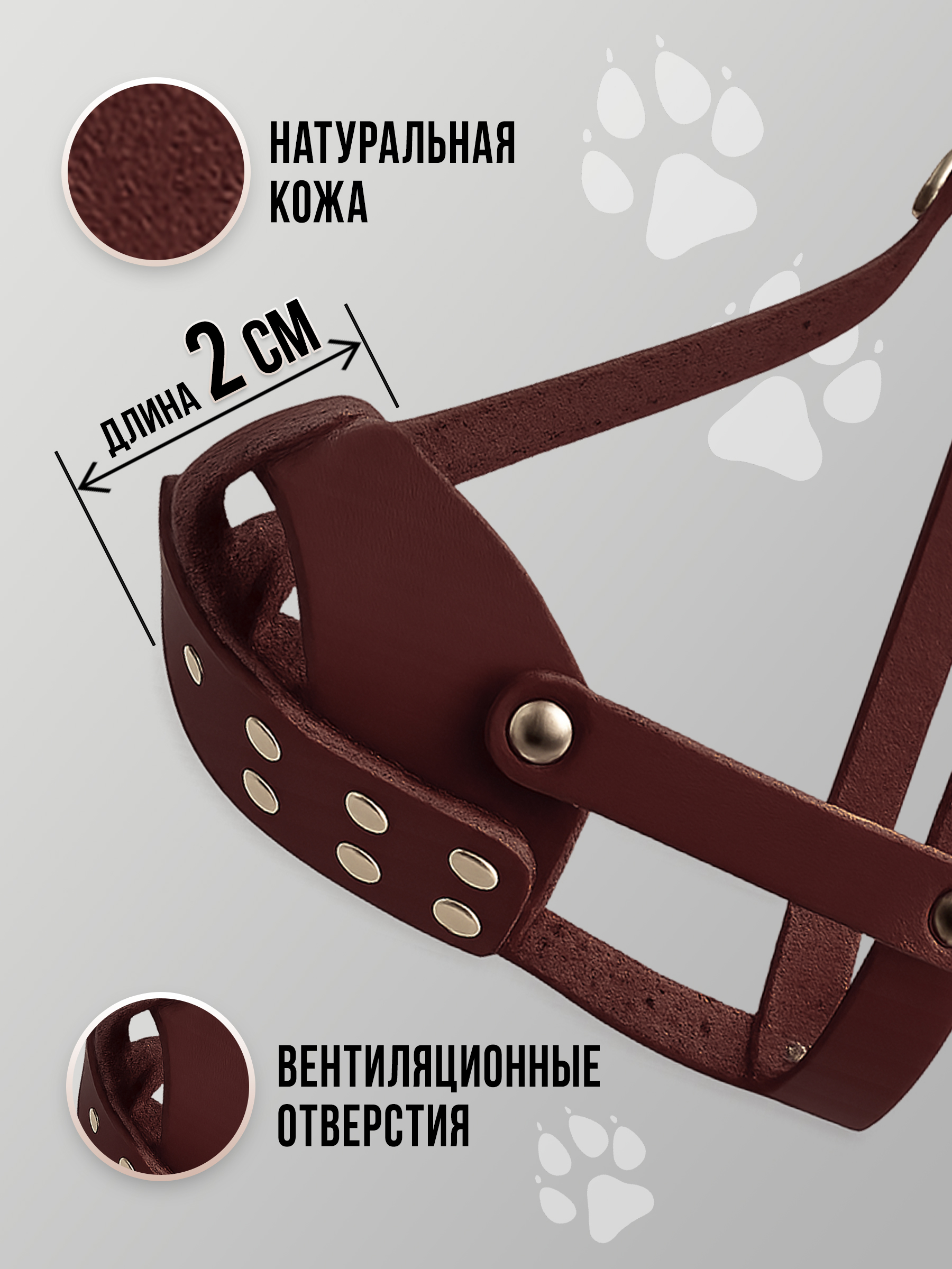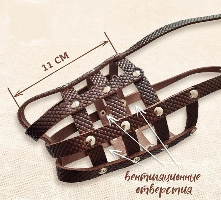 Намордник из натуральной мягкой кожи с открытой мочкой носа, защита от собирания мусора с земли, отверстия для вентиляции, дополнительный налобный ремешок.