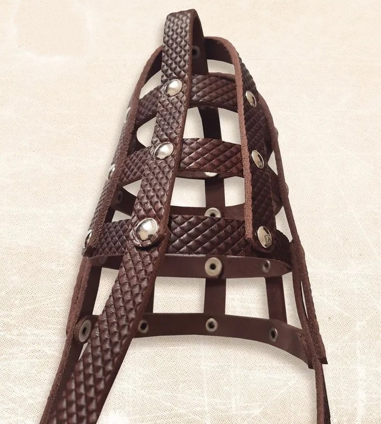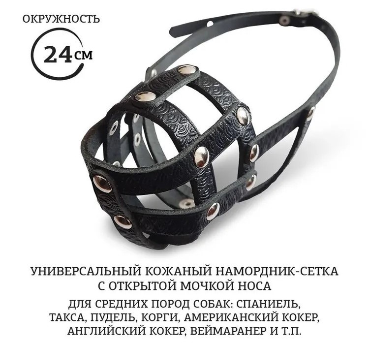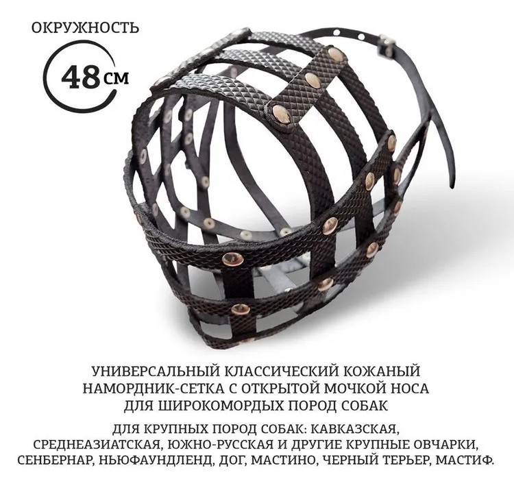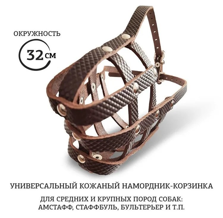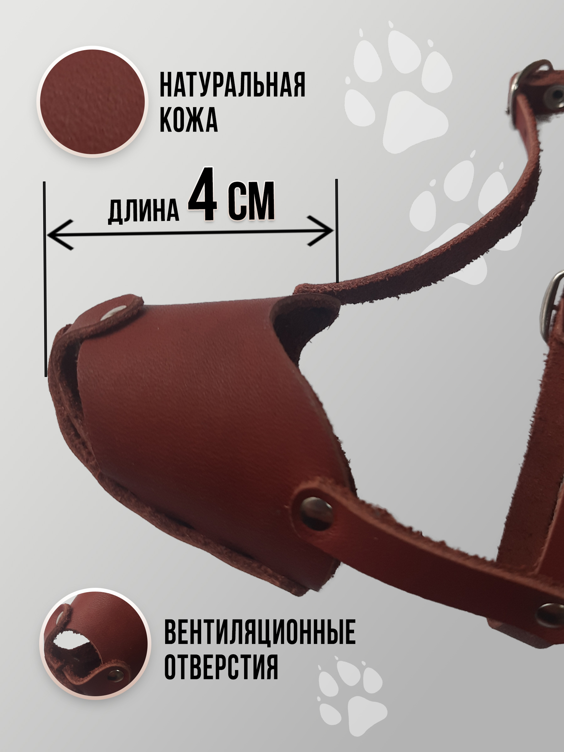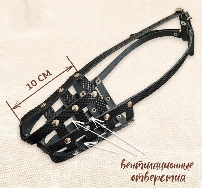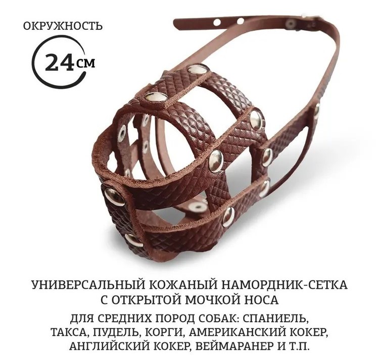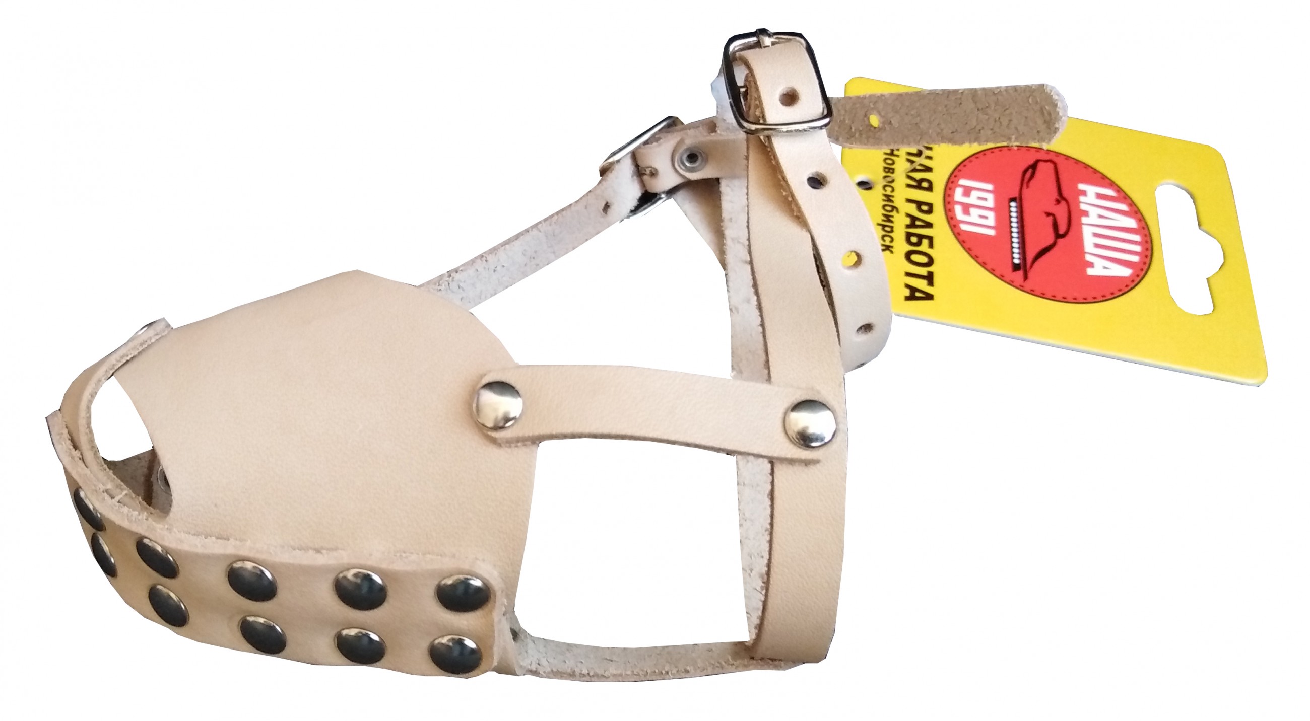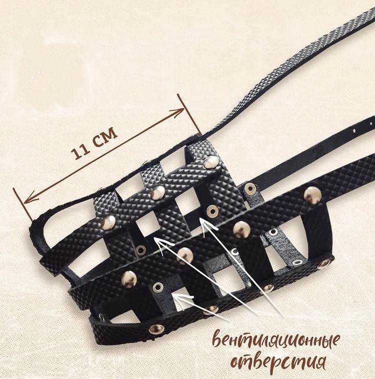 Намордник из натуральной мягкой кожи с открытой мочкой носа, защита от собирания мусора с земли, отверстия для вентиляции, дополнительный налобный ремешок.
