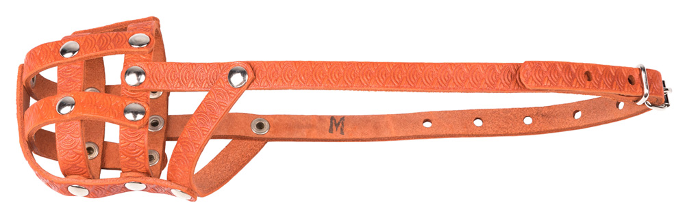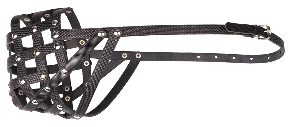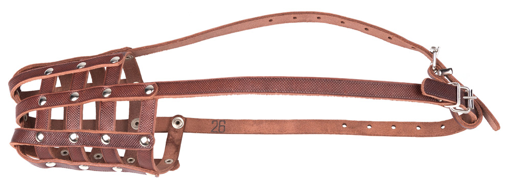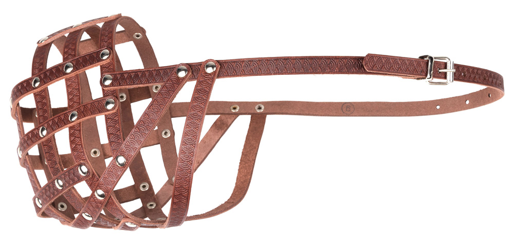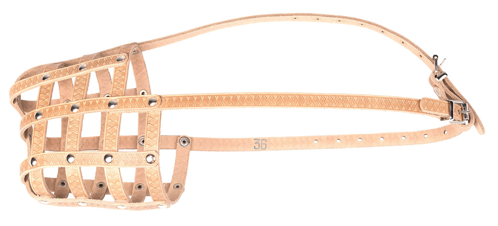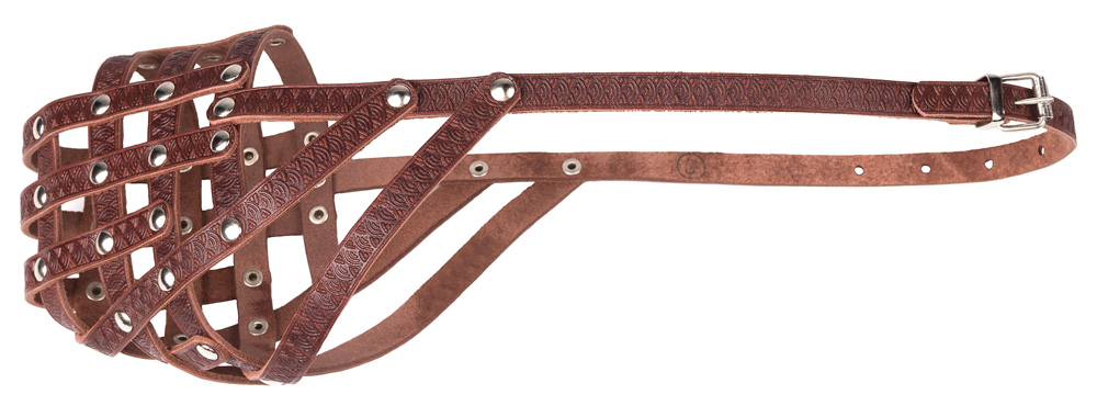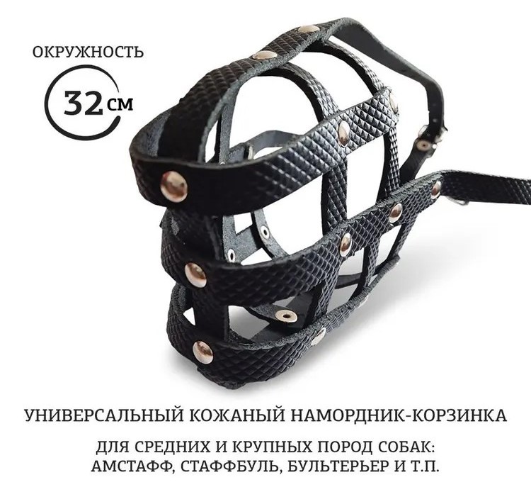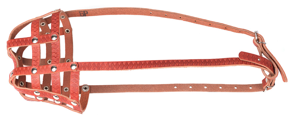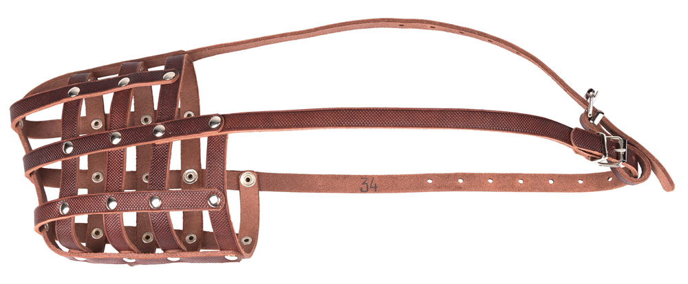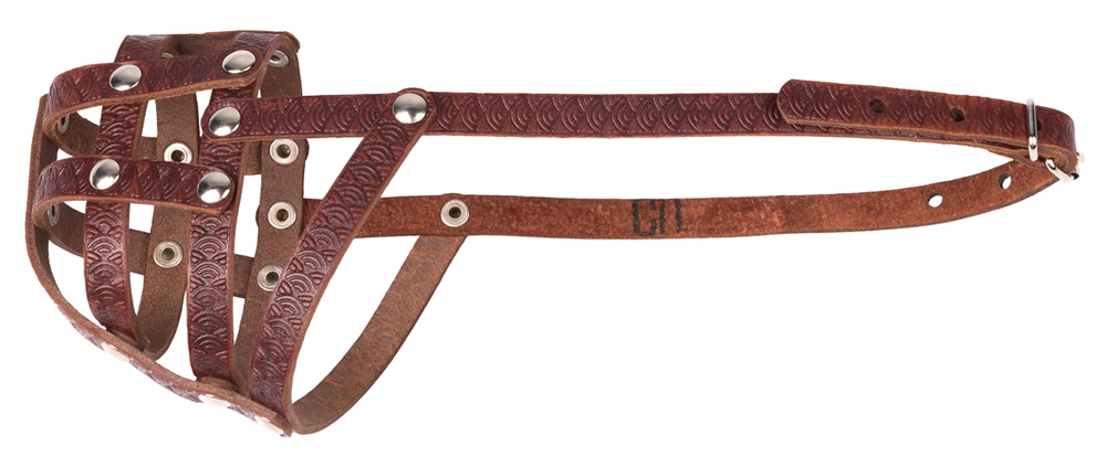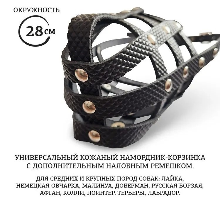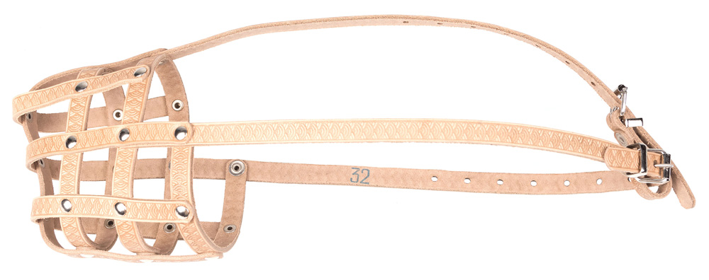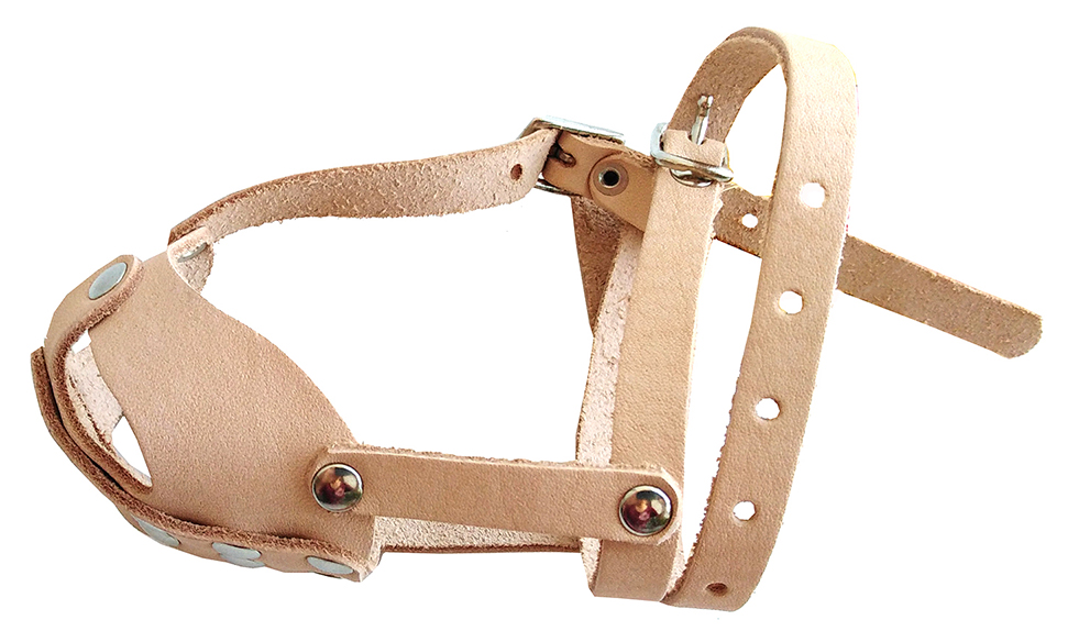 Намордник из натуральной мягкой кожи с открытой мочкой носа, защита от собирания мусора с земли, отверстия для вентиляции, дополнительный налобный ремешок.