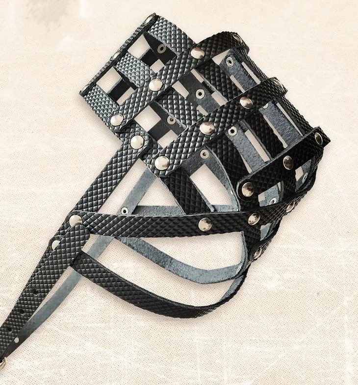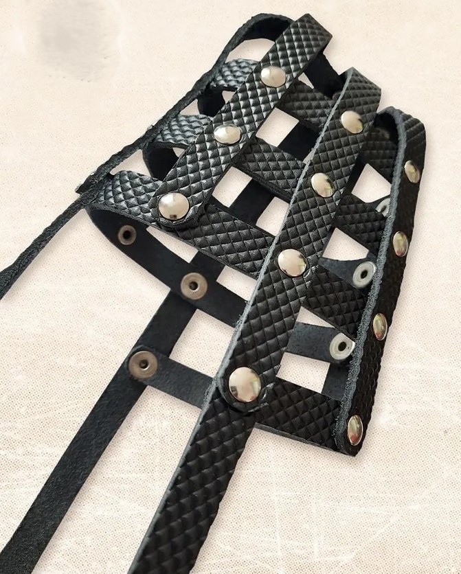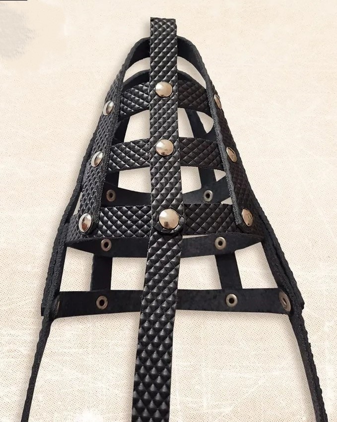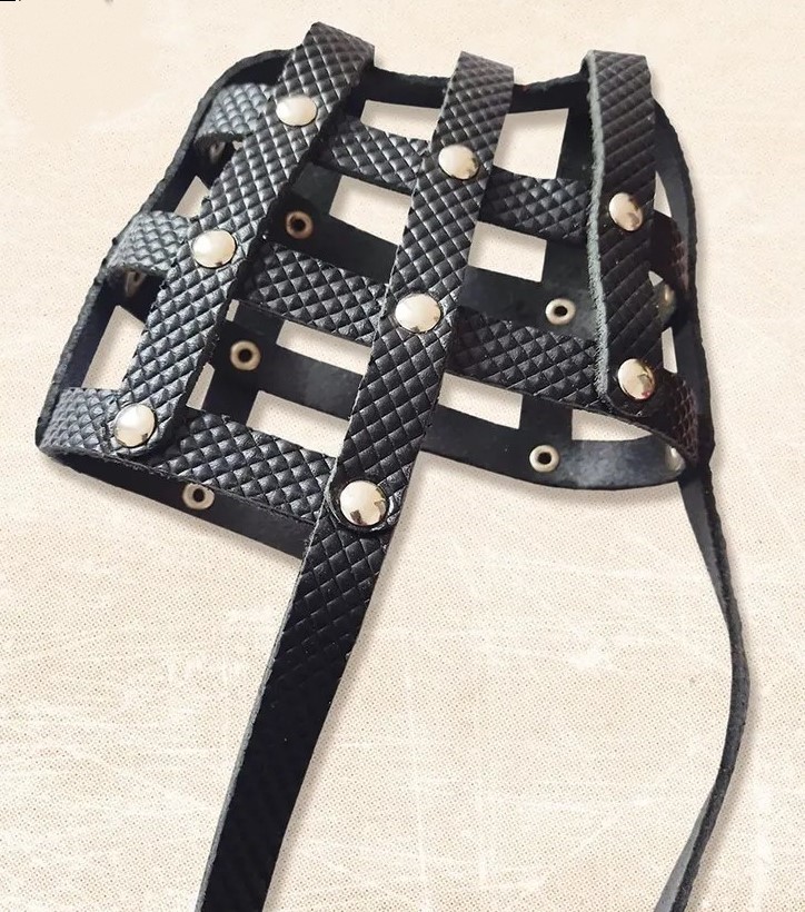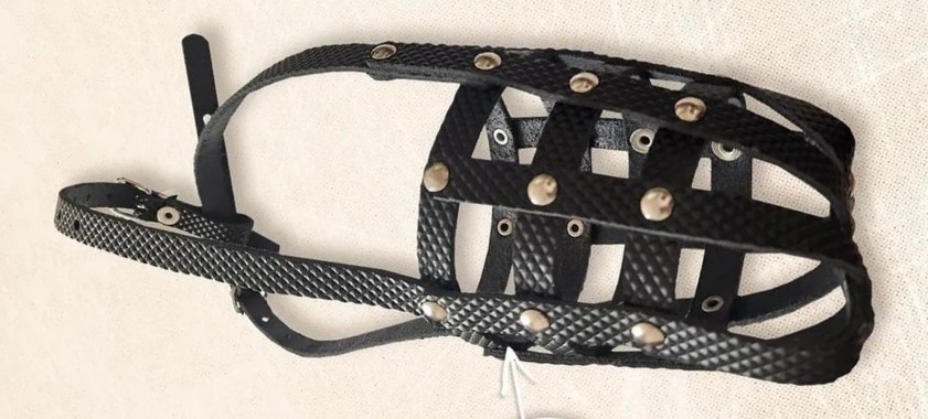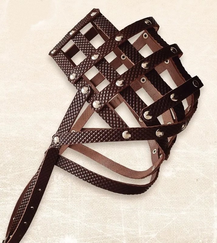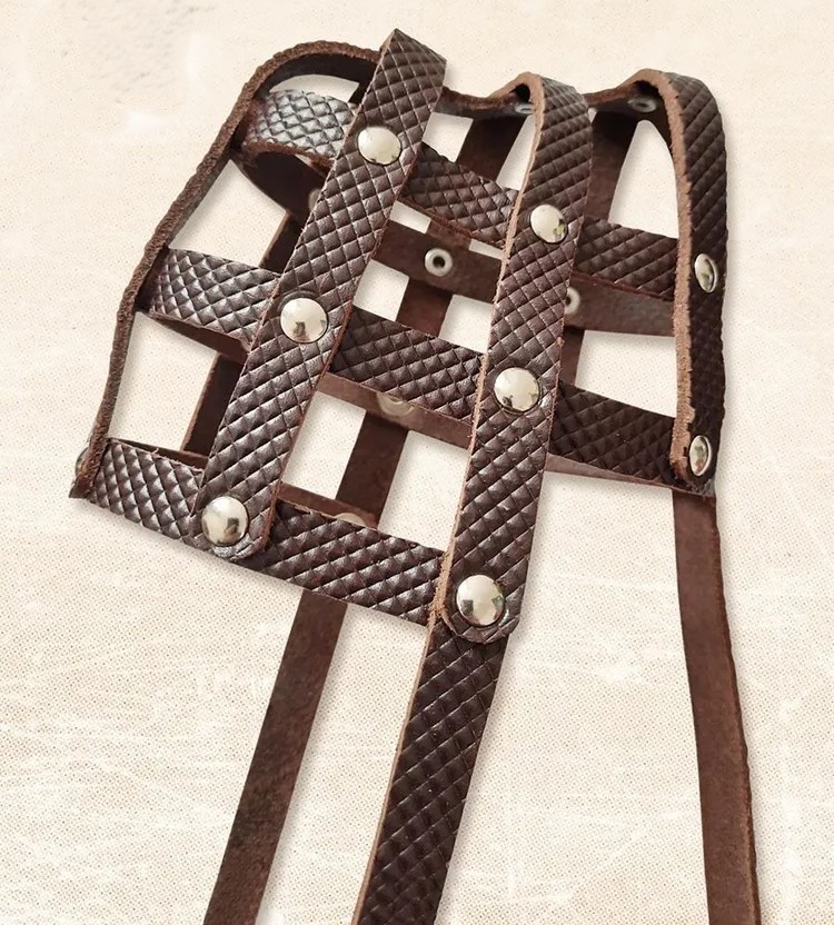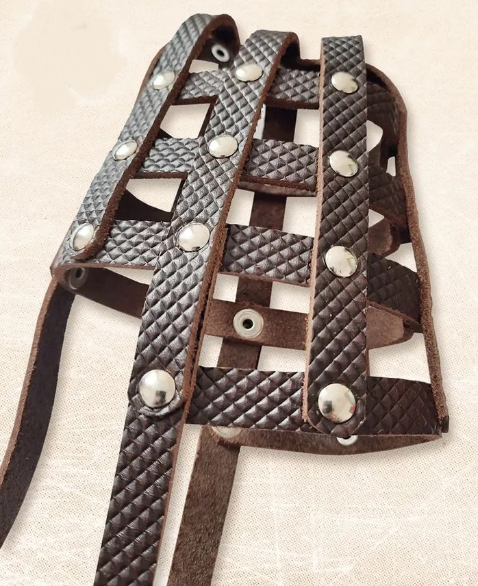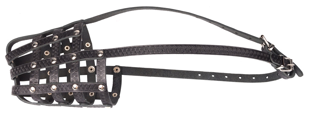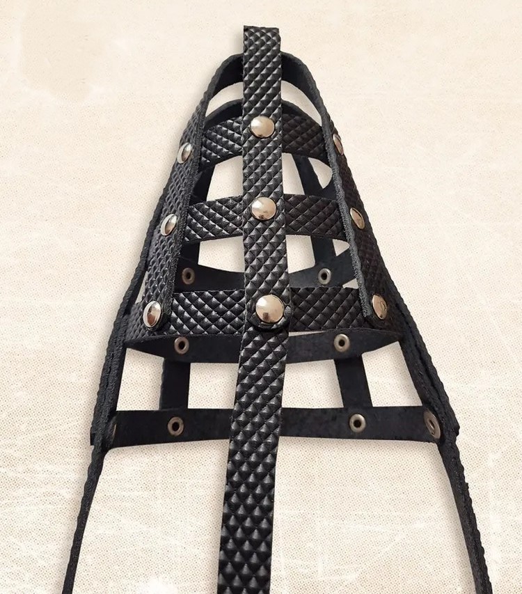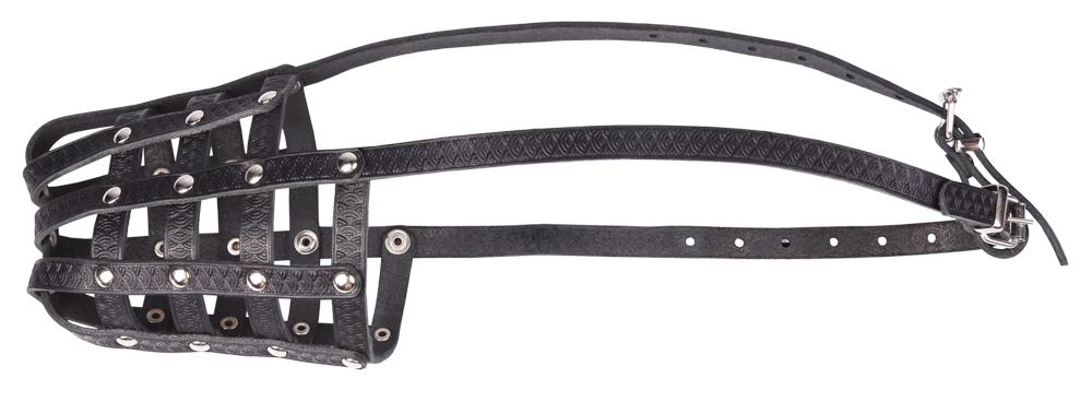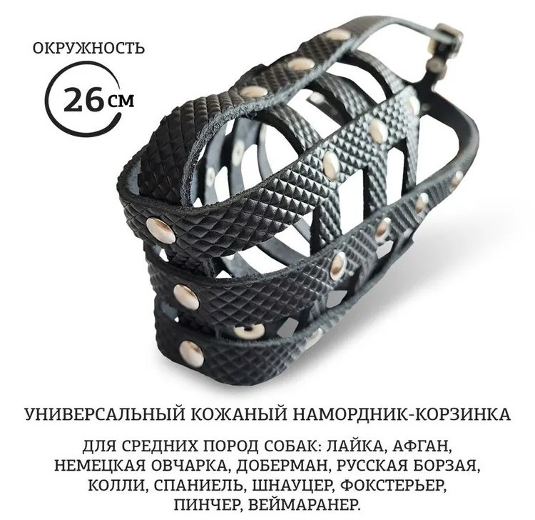 Намордник из натуральной мягкой кожи с открытой мочкой носа, защита от собирания мусора с земли, отверстия для вентиляции, дополнительный налобный ремешок.